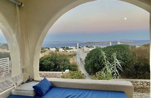 Brand new flat in quiet surroundings with breathtaking sea view over to Naxos. Walking distance to beaches, Super market, Restaurants, bars and the bus stop. Great hiking trails close by. Sleeps easily 3. Perfect patio overlooking the Sea. Paros was voted Europe's most beautiful island. The new Mykonos ( we hope not) You can get to Paros via the ferry from Mykonos or from Athens. Or you can fly via Athens on a very short flight directly to Paros airport.