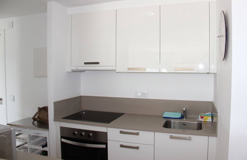 The apartment with an area of 54m2. It has a living room with sea views separated from the kitchen by an American bar, which is fully equipped with all necessary appliances, induction cooker, oven, microwave, full-size refrigerator, dishwasher and washer-dryer in addition of a bedroom with sea views, a bathroom and a terrace of 9m. Ideal for 1 to 4 people. We have a bed with two 1.05 x 2 bed bases, (separable if desired), that is to say, it has a width of 2.10 cm, in addition to a double sofa bed. The apartment has adjustable centralized air conditioning, wooden floor and is rented with bed linen and towels included