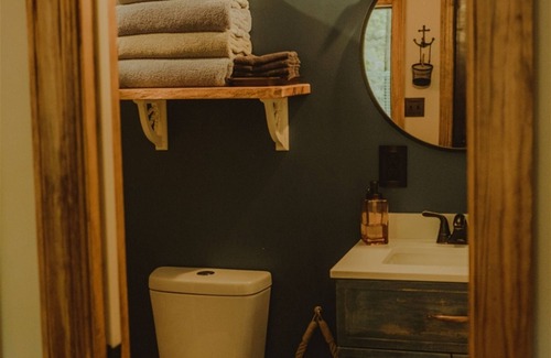 The Captain's Quarters contain the kitchen, full bathroom (with shower) and second queen bed. The entire site has pulled architectural inspirationfrom old wooden hand-hewn ships. Both the wood creations we've crafted and landscape really need to be seen in person to capture the magic of this place designed to help your imagination run wild! The lower hull of the Captain's Quarters is mounted to a massive boulder and includes a lounge net, front deck, and roof deck. Each unit includes heat, air conditioning, electricity, and full indoor plumbing. Sail away!
