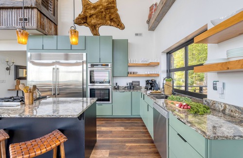 The adjacent gourmet chef's kitchen has top-of-the-line appliances and everything your group will need to prepare and enjoy picture-worthy meals, complete with a sitting and serving bar that opens directly onto the deck.