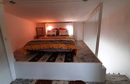 The main room is equipped with an american kitchen and a shower room, TV, sofa and internet connection. A washing maching is available. On the 1st floor, a large bedroom with a queen size bed installed in a mezzanine, lot of space to organize your clothings.