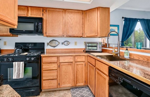 Inside the freshly remodeled townhome, the open floor plan is a design element that brings family or friends together to share quality time and good conversation, effortlessly. The kitchen is fully stocked with cookware, dishware, utensils, and features a full-size fridge, gas stove, microwave, toaster oven, blender, dishwasher, large sink with retractable spray kitchen faucet, plenty of cupboard and counter space, breakfast bar and coffee station. (We provide dish soap and soap for the dishwasher.) The coffee station has a Keurig, French press, pour over, coffee grinder, fresh coffee beans, milk-frother, tea, cocoa and popcorn!