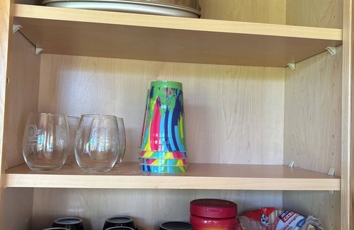 Large counter space, storage and dining table for prepping and serving food. We do include paper napkins, 2 ice trays and salt and pepper to get you started. Anything you may need please bring with!