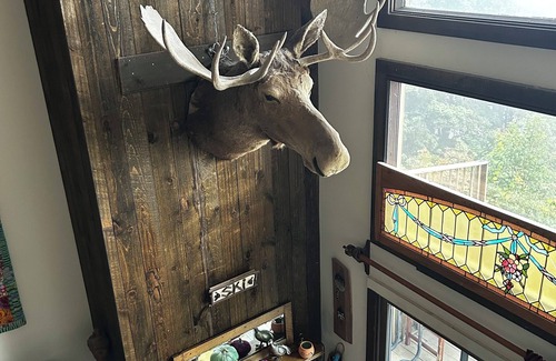 Open floor plan and a large deck with 2 sets of sliding glass doors to enjoy the view from every room. The open main room features a large fireplace,with free wood,that creates a warm cosy atmosphere.