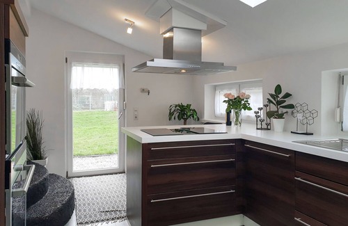 "Sternenhimmel", 3-room semi-detached house 111 m2, on the ground floor. Modern and tasteful furnishings: large living/dining room 36 m2 with satellite TV (flat screen). Exit to the terrace. 1 room 20 m2 with Dressing room with 1 double bed (160 cm, length 200 cm), shower/WC and hydro massage bath. 1 room 14 m2 with 1 double bed (140 cm, length 200 cm). Open kitchen 14 m2 (oven, dishwasher, 4 ceramic glass hob hotplates, kettle, microwave, freezer, electric coffee machine, steamer) with bar. Exit to the terrace. Sep. WC. Large terrace 40 m2. Terrace furniture, barbecue. Facilities: Internet (WiFi, free). Please note: non-smoking house. Smoke alarm. The bathroom can only be accessed through one of the two double rooms.