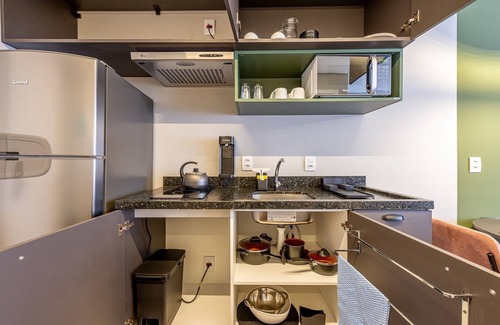 Access to the space is through facial recognition. The unit password will be sent after your check-in, via the Xtay app or Web check-in, as informed by message. The condominium offers a gym, pay-per-use laundry, and a 24-hour convenience store.