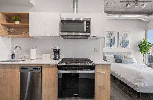 Welcome to our newly constructed Nude Building studio condo in downtown Calgary! It features expansive floor-to-ceiling windows that invite in abundant natural light, a cozy queen bed, a plush sofa and a fully stocked kitchen.