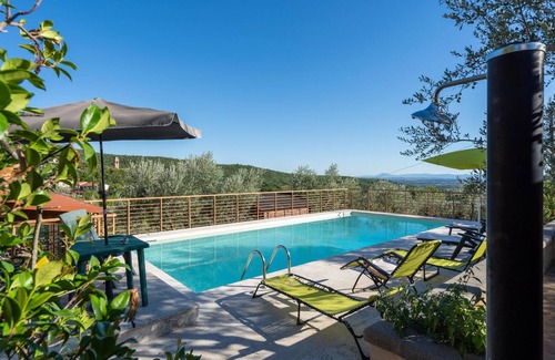 This holiday home with private pool is situated on a slight hill above the beautiful Chiana Valley, about 2 km from Rigutino, surrounded by olive groves. On the fully fenced property you have exclusive use of the secure pool area - saltwater pool; also covered terraces (3) with barbecue, table tennis and table football. Gated entrance shared with the owner, who lives in the outbuilding on the property. A place to relax, but also for hiking and biking, for example in the nearby Lignano Nature Park (2 km). For bikers, there is the central cycle path in the Chiana Valley, which leads from Arezzo to the Etruscan town of Chiusi. Visit Arezzo (15km) with its picturesque historic centre, the unique Piazza Grande and the frescoes by Piero della Francesca in the church of San Francesco; a special attraction is the large antiques market on the first weekend of every month and the Saraceno equestrian games, which take place in the piazza in summer. Or the picturesque Etruscan town of Cortona, which has dominated the valley for thousands of years and is only 20 kilometres away. Wine tasting in the medieval town of Montepulciano (40km) is a must and the charming Renaissance town of Pienza (45km) with breathtaking views over the Orcia Valley (45km) will remain a vivid memory. In half an hour's drive you can reach Lake Trasimeno with its sandy beaches and small islands (35km). Also within an hour's drive: Siena with the most beautiful square in the world, the "Campo" (80km) and the Umbrian capital Perugia (70km). And right next door to discover: Castiglion Fiorentino (7km) with its medieval castle, nice shops, supermarket, restaurants, bars and a colourful weekly market. Unpaved access road.