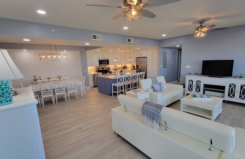The interior is thoughtfully designed with a bright, airy layout featuring a large kitchen island perfect for casual meals or gathering with friends. Floor-to-ceiling windows flood the space with natural light, enhancing the coastal atmosphere. The fully equipped kitchen includes everything you need to prepare delicious meals, while the spacious living room provides a relaxing space to unwind after a day at the beach. High-speed wireless internet and air conditioning add to the home-away-from-home comfort.