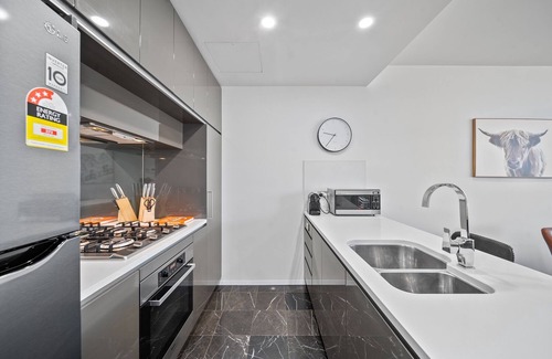 Step into this spacious 1-bedroom apartment designed for modern living. The bedroom features a comfortable king-sized bed, blackout blinds, and ample storage, while the en-suite bathroom adds privacy. The open-plan living area boasts a cosy couch, a dining table for four, and a balcony with outdoor furniture for relaxation. The fully equipped kitchen includes modern appliances and a coffee machine for your convenience. A dedicated study nook in the dining area is ideal for work or study. With ducted air conditioning and sleek decor throughout, this property offers a serene and stylish stay.