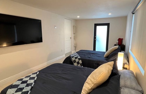 Totally separate and private entrance room with a full bathroom, 2 queen beds, tv, wifi and a mini fridge, Kuorig cofee maker with welcome coffee pods, all for your use! Room equipped with fire alarm, fire extinguisher and first aid kit, hair dryer and a dedicated work space, super fast wifi connection, Gazebo, hammocks, pool and a basketball hoop for your use and enjoyment. Free Tesla & J1772 charger level 2 on the premises!