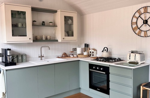 Our stunning new lodge, set in its own private corner of a wildflower meadow, gets the sunshine most of the day as well as being the ideal place to watch the sunset. It has been beautifully furnished and finished with luxurious 400tc bedding, towels, bathrobes and slippers together with Duck Island toiletries. The kitchen has a built in fridge with freezer compartment, oven with hob, toaster, coffee machine, and all the necessary crockery, cutlery and cookware. There is a comfy sofa and eco friendly ethanol burner for cosy nights with an internet tv together with a dining table and chairs. Outside is a large deck with bench storage for outdoor cushions and throws, Solo Stove, dining table and chairs and a large cast iron claw foot bath tub. Just below the deck is a seating area with Adirondack chairs, Kadai Fire Bowl with grill, double hammock and outdoor lighting. Every care and attention has been made to ensure you have everything you could want for the most relaxing stay.