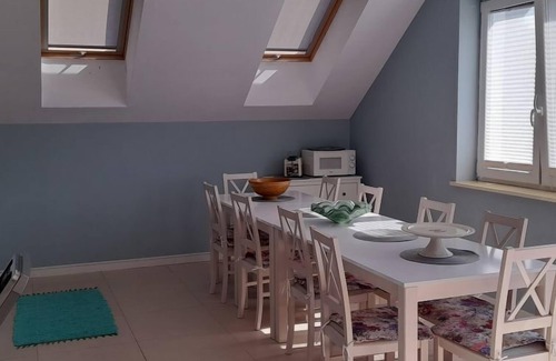 Comfortable apartment house "Willa Spinaker", 2 storeys, built in 2018. In a sunny position on a slope, 1.5 km from the sea, in the countryside. For shared use: property 1'350 m2, large garden 1'200 m2, lawn for sunbathing. Garden furniture, barbecue. In the house: WiFi, central heating system. Parking at the house. Shop, grocery, restaurant 350 m, bus stop 200 m, railway station 5 km, sandy beach 1.5 km, public bathing area 750 m. Please note: the owner lives on the same property. The owner lives in the same residence. Main road 300 m from the property. All houses/apartments are individually designed/furnished.