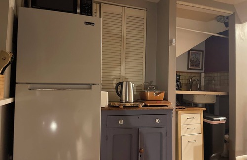 Unwind in Brookline at this lovely apartment. This tranquil space offers a pleasant living room with a cozy couch that folds flat like a futon for extra guests. Enjoy the gorgeous shower in the bathroom, along with convenient amenities like heating, AC, WiFi, and a free washing machine below. A great place to call homebase while you're away, we hope you enjoy your stay.