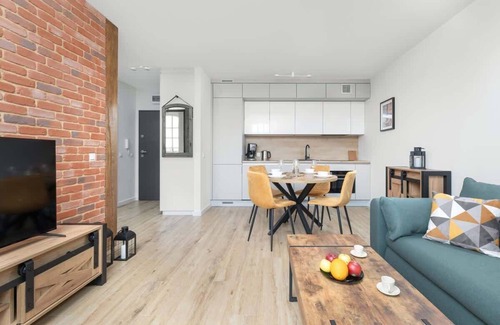 The modern apartment is located on the third floor and offers accommodation for four people. This arrangement makes the place ideal for a family or a group traveling together. The rooms are decorated in loft style, and accessories in vivid colors brighten up the interior. Two beds are located in a separate bedroom on a double double bed, and another two in the living room on a double sofa bed. The kitchenette is fully equipped and suitable for preparing delicious meals. Among other things, it contains an induction cooktop, oven and microwave. A dishwasher is an added bonus. You should also try coffee from the available capsule coffee maker - it will be perfect for starting another day full of excitement. The bathroom is equipped with a comfortable bathtub, towels and a special set of complimentary toiletries. A washing machine is sure to come in handy during longer stays or for parents with small children. The apartment has access to all multimedia amenities, including a high-speed WiFi connection and a flat-screen TV with SmartTV+ function.
