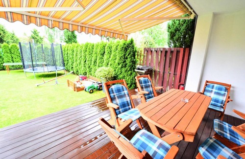 Layout: Ground floor: (open kitchen(hob(4 ring stoves, induction), electric kettle, toaster, coffee machine, oven, microwave, dishwasher, fridge-freezer), Living/bed room(double sofa bed, TV(flatscreen, satellite, german television channels), dining table, DVD player), bathroom(bath tub, washbasin, toilet, hairdryer)) On the 1st floor: (bedroom(double bed, TV(flatscreen, satellite, german television channels, international television channels)), bedroom(double bed, double sofa bed), bedroom(2x single bed), bathroom(shower, washbasin, washing machine), toilet(toilet), single box bed) garage, Internet access, Lawn, baby bath, heating(central), terrace(roofed), garden(private, fenced, 350 m2), bicycle storage, garden furniture, sun loungers, BBQ(charcoal), parking, trampoline, sand pit, high chair, toys, baby crib(free)