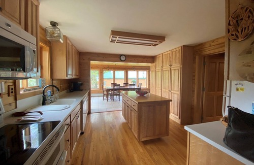 The Dam House has 3 bedrooms - the master bedroom is upstairs (queen bed with en suite bathroom with shower), a queen bedroom downstairs that is connected to the living room (separated by an accordion door), and two twin beds in the upstairs loft area. It can comfortably sleep two couples or is perfect for a family of 4-6. Please note that the downstairs bed is connected to the living room and does not have a designated/ separate space! The living room with large picture windows and French doors looks out at Lake Independence while the dining room with wall to wall windows overlooks the Iron River. The kitchen is large and spacious with birds-eye maple cabinets and updated appliances.