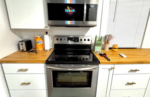 Rock out in the heart of DOWNTOWN, Bardstown, KY, right on Main Street! This cozy upstairs apartment is perfect for two! Enjoy a rock n roll themed full kitchen, in-unit laundry, and a bedroom/living area. One designated off-street parking spot included. Walking distance to top distilleries, local restaurants, shops, and more in the Bourbon Capital of the World. Private unit with its own entrance; stairs are shared with one other unit next door. Park once and explore everything just steps away!