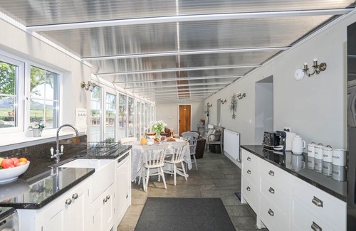 Amenities: Central heating. Dual fuel Range cooker with electric oven and gas hob, microwave, American fridge/freezer, washing machine, tumble dryer, dishwasher, wine fridge. Tassimo coffee machine and coffee percolator. 4-slice toaster. 2 x Smart TVs, DVD player, selection of books and games, WiFi. Travel cots and high chairs provided. Bed linen and towels inc. in rent. Off-road parking for 8 cars. Enclosed rear garden with furniture, BBQ/ Fire pit and heated indoor/ outdoor swimming pool. Initial starter pack supplied. Sorry, no smoking. 3 well behaved dogs allowed, enquire for more. Shop 2.9 miles, pub 2 miles. Note: Check-in from 4pm, check-out at 10am