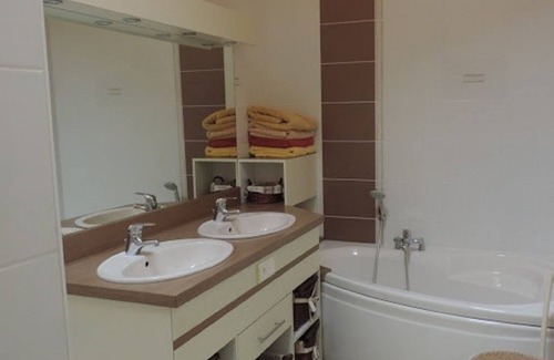 it is composed of a beautiful kitchen arranged around the bread oven in good condition, a living room of about 40m2, 2 bedrooms on the red floor + WC + bathroom - 1 bedroom upstairs + bathroom communicating water + wc on the landing.