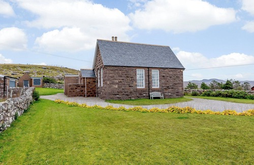 Bathroom: Bath With Shower Over, Heated Towel Rail, Toilet. Oil central heating, electricity, bed linen, towels and Wi-FI included. Travel cot and highchair available. Fridge/freezer and tumble dryer in garage. Welcome pack.. Large enclosed lawned garden with sitting-out area, terrace, garden furniture and BBQ. 2 dogs welcome, to be kept on leads around livestock. Private parking for 3 cars. No smoking. Please note: 1 step in the garden.. Originally the village school that served a small rural community in north west Sutherland, The Old School House has been transformed into a delightful stone cottage surrounded by its own enclosed landscaped cottage gardens. The lounge runs the length of the cottage. With the original high ceilings, large windows and Victorian fireplace, this superb room has a warm, welcoming ambience and provides plenty of space for guests to sit and admire the view whilst enjoying a wee dram or two in front of the open fire. There is a large double bedroom with a super king sized bed, a twin room and a small third bedroom with bunk beds for two children. They are all attractively presented with colour co-ordinated soft furnishings. The gardens are a real delight, with a stone slab path leading up through the flower beds to a garden seat from which there are spectacular views across the bay to Handa Island and the Outer Isles. The mountains of Foinavon, Ben Stack and Arkle are also visible.