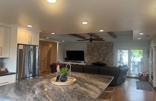 With an open floor plan, large kitchen and plenty of outdoor space, this unique gem is perfect for your stay. 5 bedrooms/3 full bathrooms (2 kings, 1 queen, and 4 twin beds) sleeps 10 easily. The home is well stocked with many amenities. Enjoy the swimming pool, spa, outdoor kitchen and more! The pool and spa have locking covers for safety. The custom tree house is super fun! The home is situated on an active orchard, so depending on your timing, you will be surrounded by gorgeous blossoms, fresh fruit or vibrant fall colors. We hope you enjoy The Orchard Oasis, our little slice of paradise! No pets please. Additional charge if more than 10 guests.