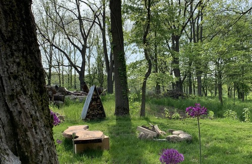 The Sanctuary is located in a wonderful blend of farm and nature for a peaceful getaway. It was designed and handcrafted by your hosts to reflect the peacefulness of a simple farm life while giving you the amenities of modern life. Inside: Designed in a studio style it features a soaking tub with hand shower, a full kitchen, a custom queen bed with an Organic mattress and a comfy couch to watch tv as you enjoy the comfort of in-floor heating or A/c.
