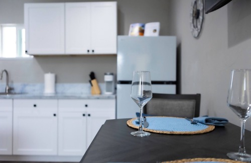 The kitchen is equipped with stove, oven, microwave, toaster and Keurig. It comes stocked with basic cooking pans and utensils so you can "stay in" comfortably when you're not enjoying all of the restaurants, coffee shops and markets in the area.