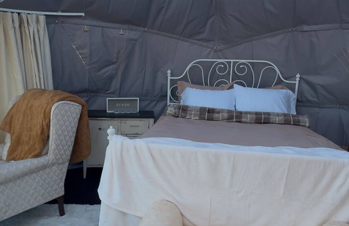 Welcome to your Glamping Experience!The Wheat Grass Dome is a tranquil haven that embraces the calm of the prairie. Styled in creams and browns with boho-inspired touches, it fosters a cozy and creative atmosphere. This dome is furnished with a queen bed, comfortable seating for lounging, and a small table for games or light meals. With a heater, lights, and phone charger, the Wheatgrass Dome offers all the comforts of modern living in a serene, nature-inspired setting.While this is glamping, the experience still mirrors the simplicity of camping—you’ll take a short stroll to the bathroom amenities(700-1200 ft away), , connecting even more with the beauty of the land. A stay in the Wheat Grass Dome invites you to slow down, breathe deeply, and experience the magic of Healing Grounds.Our cowboy kitchen offers a place to bbq and there is a small fridge that guests can share.