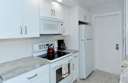 Kitchen is modern and is fully stocked with dishes, glassware, and cookware for your cooking, baking and your dining needs.