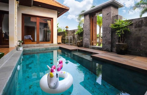 The recently built compact 2-bedrooms villa with the private pool is located within a spacious green lawn and surrounded by a fence. The good combination of reasonably and thoughtfully arranged space within the fence and a wide-open space (rice fice field view!) behind the fence allow safely enjoying the Ubud tropical day and night. The interior and design solutions express classic Balinese ones and modern features. The compact pool - but bigger than a usual plunge pool - is right in the center.