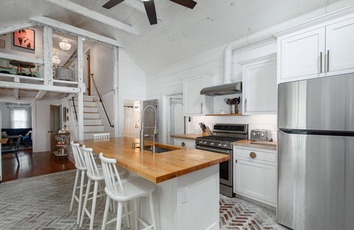 Inside the main house, you’ll find traditional farmhouse charm with modern surprises. For those looking to work remotely, the house features high-speed internet to keep your shows and conference calls streaming throughout your stay. A full espresso bar awaits all coffee lovers. Savor the sounds of nature from the comfort of the front porch as you sip your morning coffee, or ease into the day spinning some vinyl in the music loft. Gather together to cook in the fully-stocked chef's kitchen with gorgeous vaulted ceilings, Sonos speakers to set the mood, and natural light pouring through the windows.
