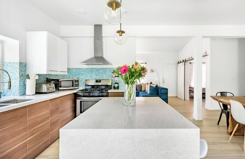 Living room features 65" flat panel UHD Smart TV and large sectional for entertaining or relaxing to watch a movie. Fully appointed kitchen comes with all new appliances, waterfall island and Italian quartz countertops.