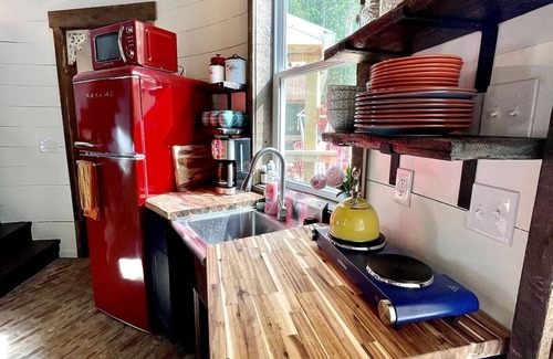 Inside Space: Inside the Silo there is a fully stocked Kitchen with an electric cooktop, microwave, toaster oven, coffee pot, full size refrigerator w/ freezer, utensils and everything for your cooking needs. We provide coffee, tea, sugar, flour, condiments(ketchup, mustard, mayo) along with spices and cooking oils.