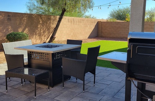 Step outside to a relaxing patio complete with a gas grill, comfortable seating, and a cozy fire pit/heater — perfect for evening gatherings or quiet mornings.