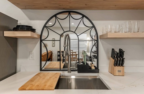 Kitchen: Equipped with modern appliances including a full-size refrigerator, gas oven range, microwave, and countertop dishwasher. Ample open shelving space for all your cooking essentials.