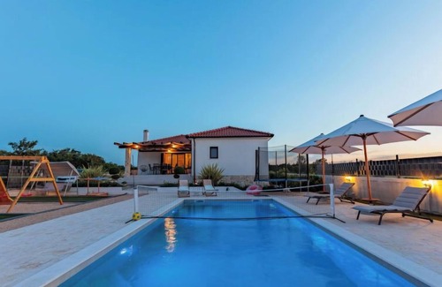 Beautiful, cosy single-family house "KLM", built in 2023. In the hamlet Rupalj 3.2 km from the centre of Poličnik, 7.3 km from the centre of Posedarje, 16 km from the centre of Zadar, in a sunny position, 7 km from the sea. Private: property 1'000 m2 (fenced) with wildlife garden, swimming pool angular (8 x 4 m, 32 m2, depth 150 cm, seasonal availability: 01.Apr. - 01.Oct.) with internal staircase. Outdoor shower, volleyball, badminton, arbour (20 m2), barbecue (swing), pool maintenance by the owner/gardener. In the house: internet access, trampoline, washing machine. Parking (for 3 cars) at the house on the premises. Shop 300 m, restaurant 500 m, bus stop 750 m, sandy beach 7 km. Please note: airfield 21 km from the property.