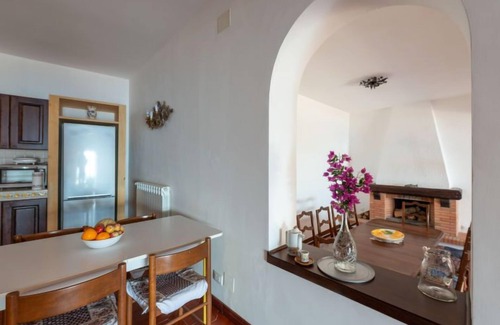 "Sole", 5-room semi-detached house 160 m2, on the ground floor. Spacious, rustic and cosy furnishings: large living room with panoramic window with open-hearth fireplace and TV (flat screen). Exit to the loggia. 3 double bedrooms. 1 room with 2 beds. Open kitchen (oven, dishwasher, 4 gas rings, toaster, electric coffee machine). Exit to the loggia. 2 showers/bidet/WC. Gas heating. Large terrace 38 m2, roofed, garden, lawn. Terrace furniture, deck chairs, covered balcony. Marvellous view of the sea. Facilities: washing machine, iron, mosquito net, children's high chair, baby cot for up to 2 year olds. Internet (WiFi, free). Parking (2 cars) at the house. Please note: non-smokers only. Private entrance, smoke alarm. IT053016C2NT4MWW6W