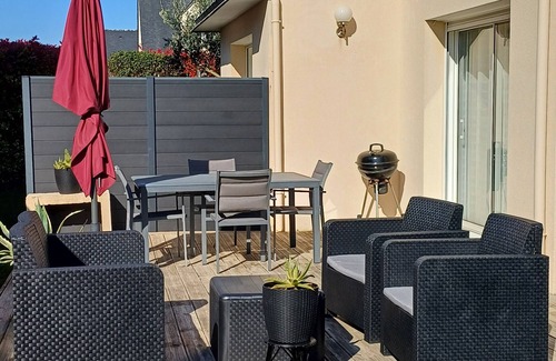 large 20 m2 wooden terrace, garden furniture, sun bed,