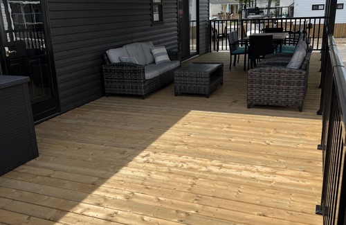 Oversized wraparound deck, 2 patio doors, firepit, barbeque, private Wifi, outdoor dining table and patio furniture, indoor and outdoor games, open concept kitchen and living area. Fully stocked kitchen including Keurig and pods and other consumables. New, modern, clean and cozy. www.sherkstonsandytoes.ca