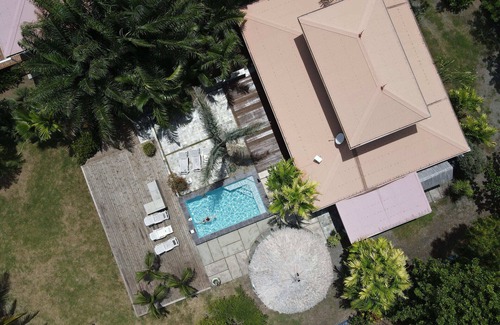 A second bungalow is located on the same grounds as Villa Colibri. It is a two-bedroom cottage. Each rental has its own pool and terrace, and there is no view between the two properties from the terraces facing the garden. Only the entrance gate is shared, as well as the large garden below (with access to the pond).