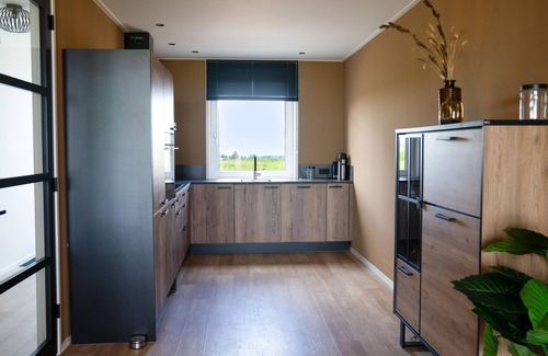Discover comfort and connection in this modern villa nestled in Leons, the tranquil heart of Friesland. Newly built in 2023, this spacious holiday home accommodates up to 10 guests across multiple floors with en suite bedrooms and a luxurious central bathroom with a bathtub. Ideal for families or friend groups, the home features a sleek kitchen, sunny garden terrace, and even a panna cage and air cushion for kids to play. Need more space? Book the neighboring villa (code NL-8833-15) for a combined 20-person stay with a charming connecting layout. Step outside into a wonderland of water and nature. Bring your pup and enjoy long walks along quiet dikes or explore pet-welcoming nature reserves like De Alde Feanen. Rent a sloop or e-bike onsite and cruise through Friesland's waterways or cycling trails. Many cafés and outdoor terraces in nearby towns such as Franeker and Sneek happily welcome dogs. In summer, join local "hondenwandelingen" (dog walks) or dog-friendly events held in Leeuwarden’s parks just 12 km away. Savor the flavors of Friesland with nearby restaurants in Baard (1.5 km), Weidum, and Leeuwarden, where fresh local dishes and Dutch classics await. Don’t miss tasting sugar bread, Frisian cookies, or a glass of Beerenburg. After dinner, return home to a sunset drink on the terrace while your pet snoozes by your feet under the stars.