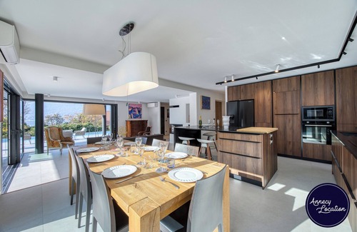 Set at the foot of Mont Veyrier, the villa is flooded with natural light ☀️ and tastefully decorated. You'll love its direct view of the pool, with the lake and mountains as a stunning backdrop 🏔️.