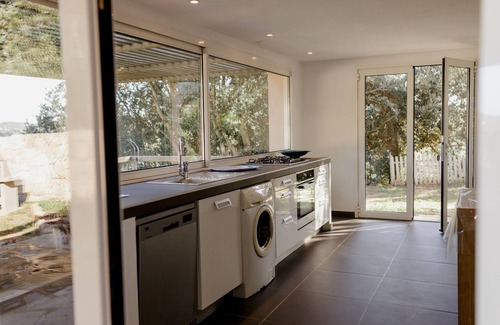 Fitted kitchen with view of the gulf. Two bedrooms, one overlooking a covered terrace with sea view. The bathroom has a large shower and a toilet, plus separate toilet.