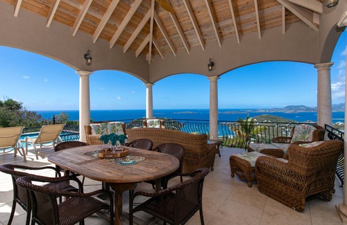 Villa Rapture is located in the exclusive Virgin Grand Estates and has year-round sunset views of Great Cruz Bay, the entire Pillsbury Sound, and beyond. Rapture is a luxurious and spacious (5000 sq ft) villa. It is a blend of classic Caribbean elegance with modern comforts and entertainment systems. Some of the classic design features include beamed cathedral ceilings, tiled roofs, white interior tiled floors, non-skid exterior tiled decks, 12 foot Doric columns, a large lanai with outdoor living area, exquisite custom crafted mahogany cabinets, furniture and vanities, and 8 foot mahogany doors. The interior spaces are located on two levels with two master suites upstairs and two more suites along with a daybed and trundle in the game room downstairs. All bedroom suites are contained within one building. This custom designed home is perfect for families or traveling couples.