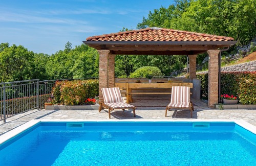 Single-family house "Villa Toni", 3 storeys. 2 km from the centre of Kastav, 7 km from the centre of Opatija, 10 km from the centre of Lovran, 7 km from the sea. Private: property 2'000 m2 (fenced) with trees, swimming pool heated (5 x 5 m, 29 m2, depth 150 cm, seasonal availability: 20.Apr. - 12.Oct.) with internal staircase and salt-electrolysis pool-cleaning system. Outdoor shower, arbour, terrace (100 m2), garden furniture, barbecue. In the house: internet access, billiard table, washing machine. 20 m footpath to the house. Parking (for 5 cars) on the premises, single garage. Shop 1 km, bus stop 600 m, pebble beach 7 km, rocky beach 7 km. Groups of teenagers on request only. Swimming pool heated (extra). It is necessary to announce 7 days in advance if the pool heating is required.