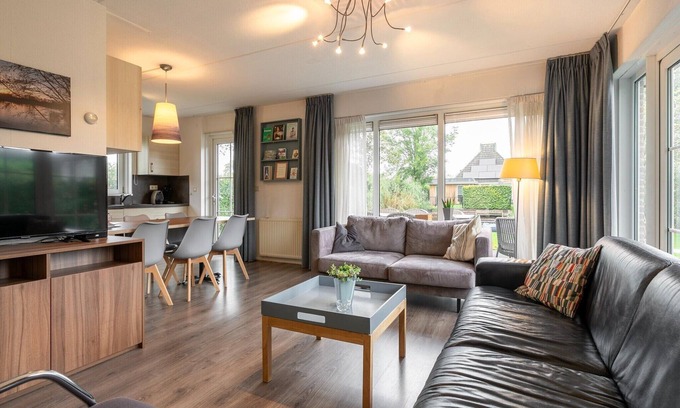 Indulge in the ultimate waterfront retreat in this luxurious wellness villa at Summio Vakantiepark It Wiid, designed for up to six guests. Set directly on the water, the villa features a private jetty and a garden where, from early April to October, a six-person sloop is ready for your summer adventures. Step inside to discover an elegant living room with a cozy seating area, television, and a separate bedstead for two adults, seamlessly connected to a fully equipped open kitchen with dining space. Modern appliances including a fridge with freezer, oven, microwave, filter coffee machine, Senseo and Nespresso machines, and a dishwasher make daily living effortless. The villa boasts two comfortable bedrooms on the first floor, each with two single box spring beds, and two bathrooms, one on the ground floor with a bathtub, sunshower, and washbasin, and one upstairs for added convenience. Step outside to the furnished patio, unwind in the outdoor spa, or watch the sun glint off the water while enjoying drinks and meals in the serene garden. A charging station for electric cars adds an extra layer of convenience. Nestled at the edge of De Alde Feanen National Park, this villa is a paradise for nature and water sports enthusiasts. Explore the Frisian lakes, cycle or stroll through lush reed beds and marshes, or spot rare birds including sea eagles. Adventure seekers can sail, kayak, or paddleboard on nearby waters, while Friesland’s vibrant cities like Leeuwarden and Sneek offer cultural trips and boutique shopping. Families can enjoy Aventoer park, Duinen Zathe, or charming local villages for endless fun. With Wi-Fi and parking included, this wellness villa offers the perfect blend of luxury, relaxation, and lakeside adventure.