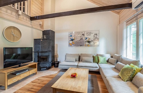 This semi-detached log holiday house located in Vuokatti ski centre was completed in 2003. Floor area 82m² , loft 27m². On ground floor there is combined living room & kitchen, bedroom with 2 beds, sauna (electric heating), washroom and toilet. Upstairs there is bedroom with 2 beds, loft vestibule with 140 cm wide bed and sofa bed and toilet. Bed and chair for a baby. Internet connection (wireless, speed 1 MB). Kajaani 33 km, Sotkamo 7 km, Vuokatti ski slope 100 m, cross country track 50 m. Beach 1,5 km. Cleaning not included, cleaning can be booked as additional service. Linen are available for rent. No pets allowed.