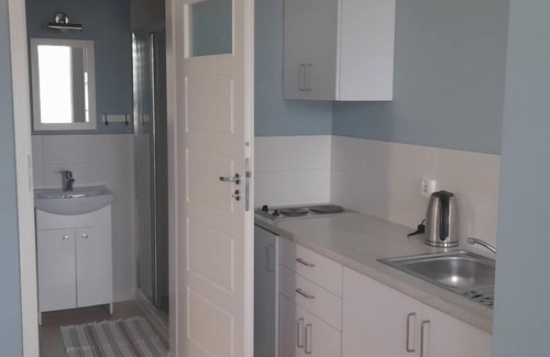 1-room apartment 32 m2, on the ground floor. Comfortable and stylish furnishings: living/dining room with 2 beds (90 cm, length 200 cm), 1 french bed (140 cm, length 200 cm), hand-basin, shower/WC and satellite TV. Exit to the garden. Open kitchen (2 ceramic glass hob hotplates) with dining table. Facilities: Internet (WiFi). Parking at the house. No internal connecting door between the separated properties. No internal connecting door between the floors.