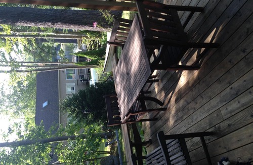 This gorgeous home has two bedrooms (1 queen and 1 double) and a bunk room for the kids (4+ twin beds) all upstairs, with full bath (walk-in shower). Downstairs is an open concept with 2 couches, chairs, lots of eating space and fully equipped kitchen and ½ bath. The large deck facing the water is wonderful for relaxing, dining, etc. The upper deck is great for morning coffee or sleeping under the stars.
